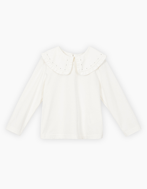 Романтичный лонгслив в нежном оттенке хрустальная роза для девочки. Прямая модель с длинным рукавом. Застёжка на пуговицу. Изящный воротник с рюшей по краю воротник декорирован стразами. Лонгслив интересно смотрится в паре с бомбером (арт. 232004).