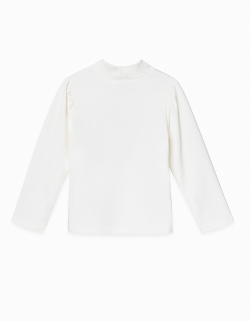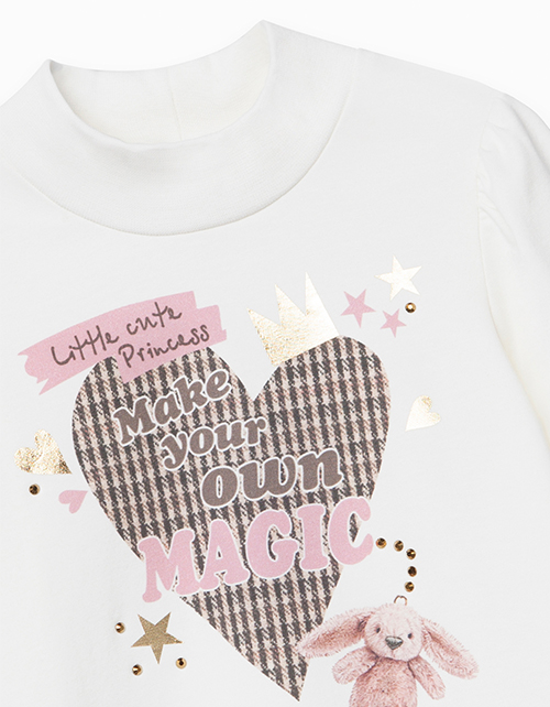 Молочный лонгслив с высоким воротником-стойкой. Декорирован милым принтом, надписью Make your own magic ("Твори свою магию") и аппликацией.