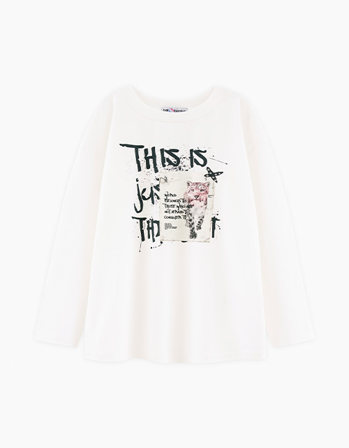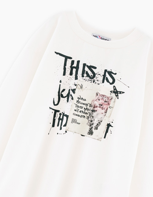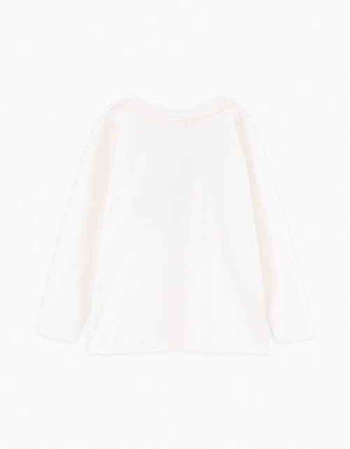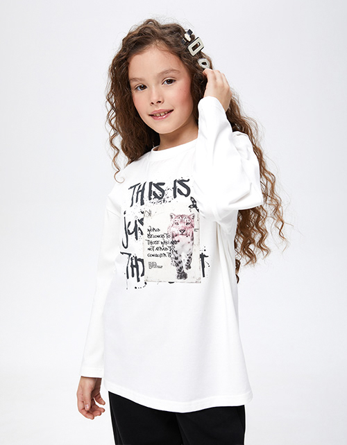 Лонгслив молочного оттенка для девочки. Модель прямого объёмного силуэта со спущенной линией плеча. Эластичная горловина из рибаны. Лонгслив декорирован дизайнерскими принтами и фразами.