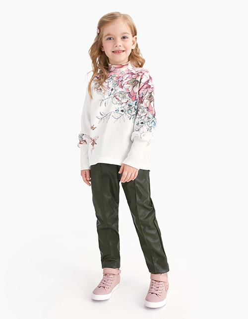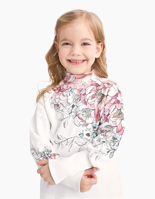Элегантный молочный свитшот с удлиненной спинкой. С воротником-стойкой и высокими манжетами. Оригинальность модели придает яркий асимметричный цветочный принт, украшенный стразами.