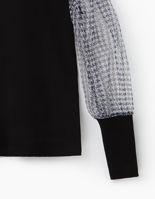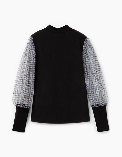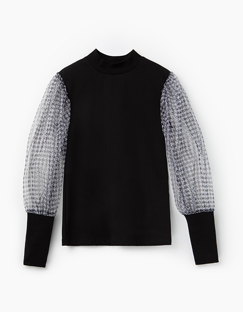 Черный джемпер прилегающего силуэта с рукавами буфами из серой в клетку сетки. Высокие манжеты из рибаны. Удобный воротник стойка из эластичной рибаны.