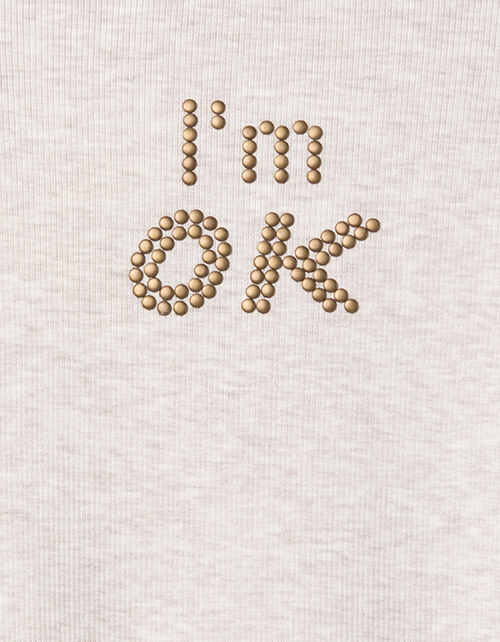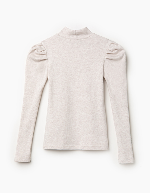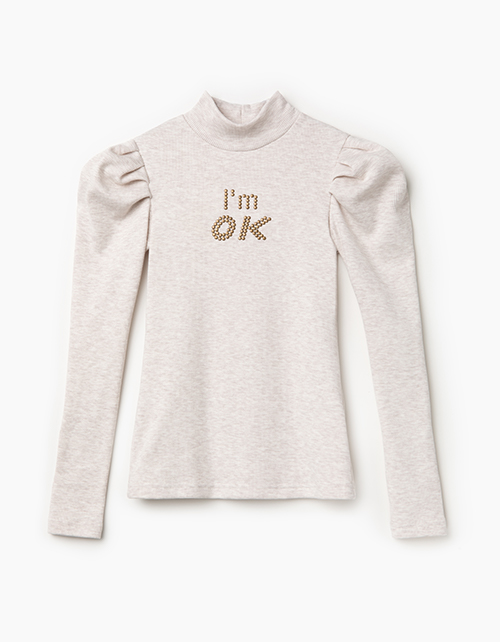 Водолазка из меланжевого кашкорсе светло-бежевого цвета для девочки-подростка. С невысоким воротником-стойкой и рукавами буф. Декорирована аппликацией из металлических страз под латунь