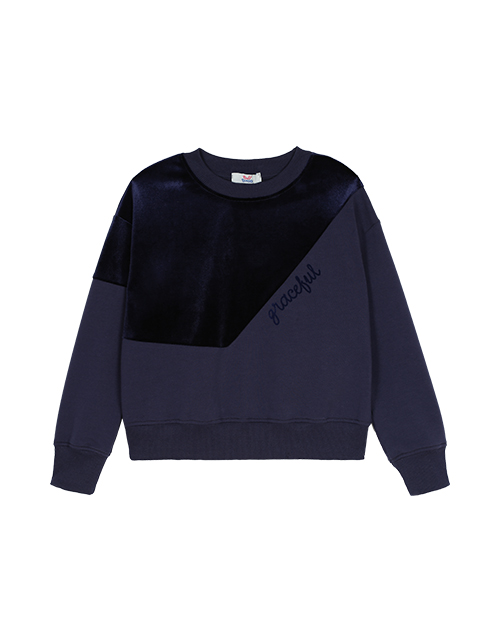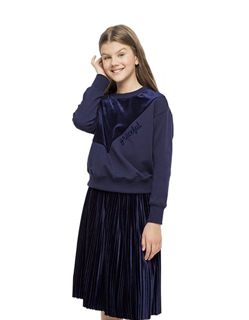 Толстовка для девочки из мягкого футера и бархата воплощает торжество комфорта и красоты. Модное сочетание двух фактур, актуальная форма и бархатная печать в оформлении модели делает толстовку стильным элементом любого повседневного комплекта.