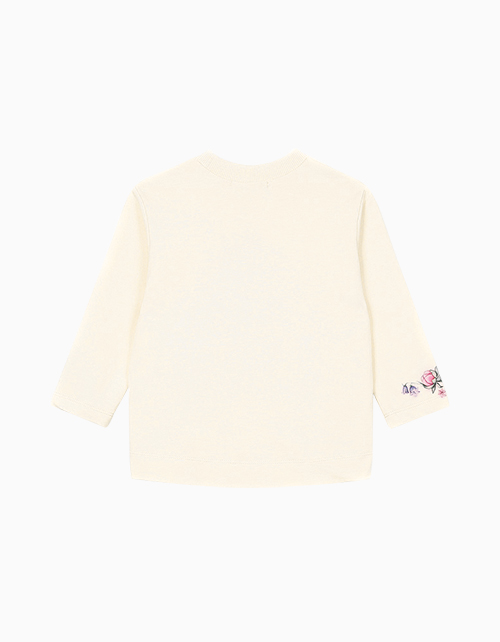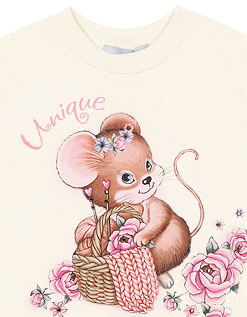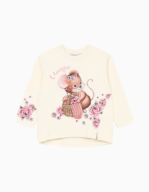 Розовый джемпер для девочки с крупным принтом в виде мышки и роз имеет свободный крой и модный дизайн. Спинка изделия длиннее переда, а горловина дополнена воротником. Используемое трикотажное полотно футер износостойкое и приятное к телу.