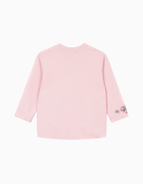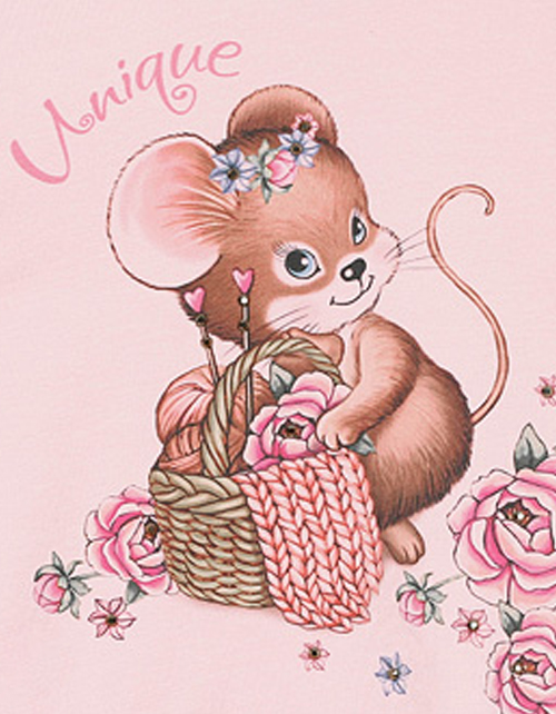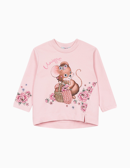 Розовый джемпер для девочки с крупным принтом в виде мышки и роз имеет свободный крой и модный дизайн. Спинка изделия длиннее переда, а горловина дополнена воротником. Используемое трикотажное полотно футер износостойкое и приятное к телу.