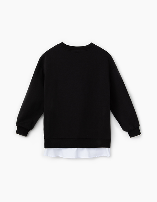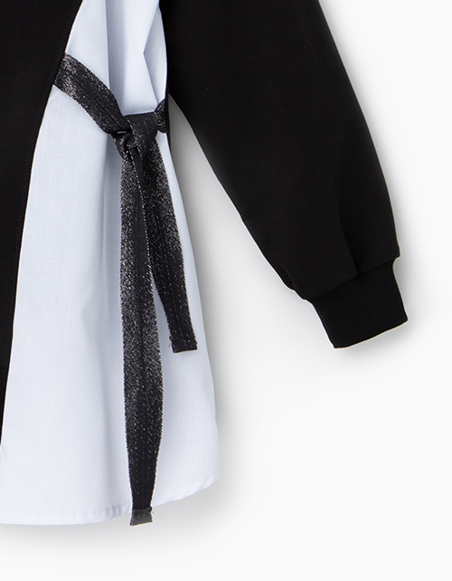 Удлиненный свитшот-обманка из джерси с имитацией поддетой под джемпер объёмной блузки из сорочечной ткани. Блузка видна в ассиметричном разрезе. Свитшот украшен лаконичной вышивкой с вкраплениями золотой и серебряной нитей в стиле английской школы.