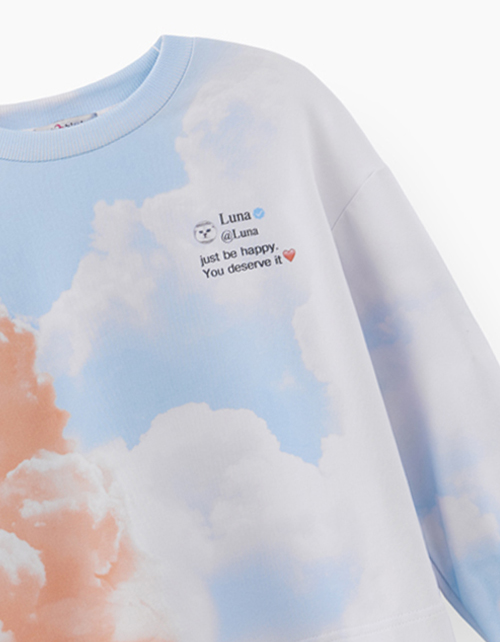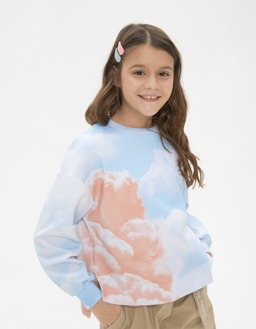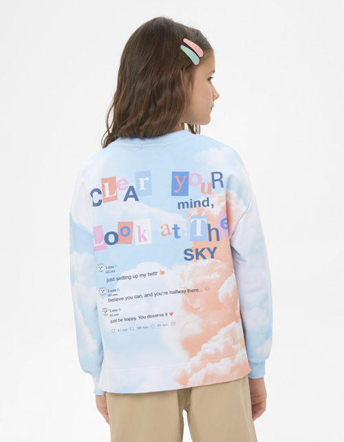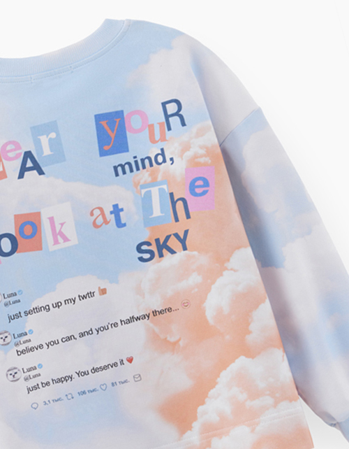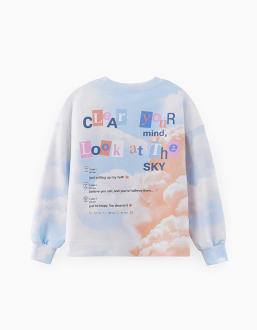 Стильный свитшот для девочки. Модель OVERSIZE. Изделие из футера декорировано оригинальной техникой принта в виде облаков. Свитшот с дизайнерскими шрифтами, как будто вырезанными из журнала.