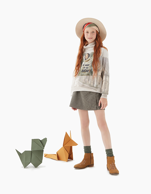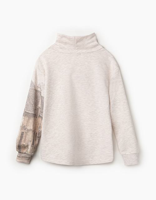 Свитшот с удлиненной спинкой для девочки. Из бежевого меланжевого футера и рибаны. Мягкая горловина-стойка с драпировкой создает ощущение уюта. Принт-коллаж, переходящий с полочки на рукав, добавляет модели шарма