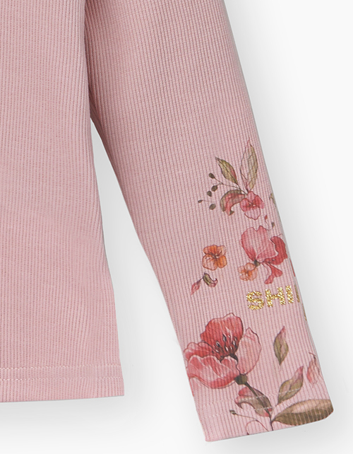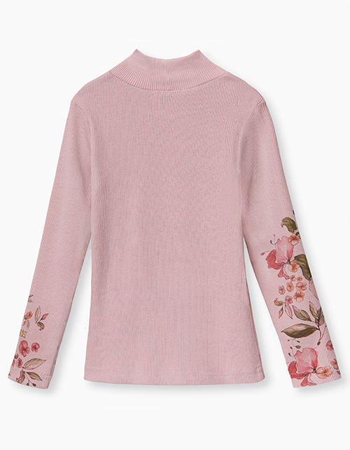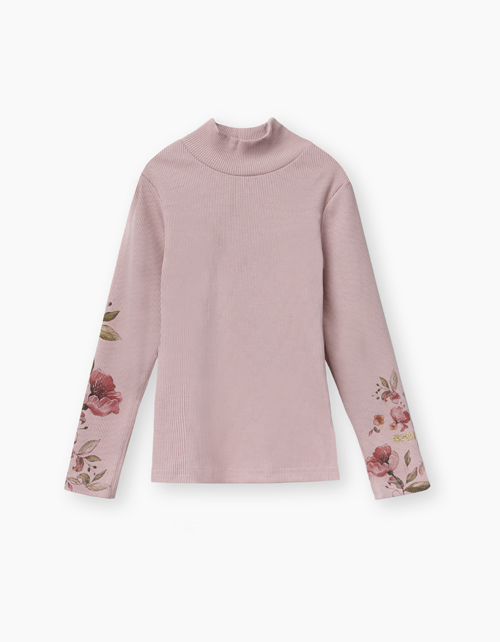 Трикотажный джемпер темно-розового цвета для девочки. Полуприлегающего силуэта, с воротником-стойкой. Рукава декорированы цветочным принтом, дополненным вышивкой с пайетками по левой стороне