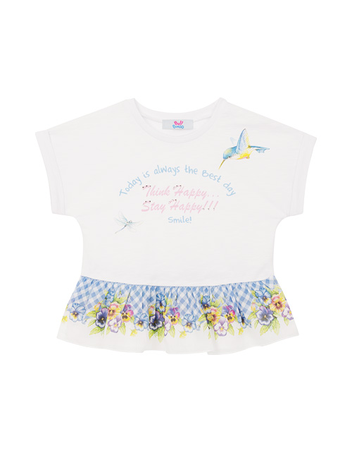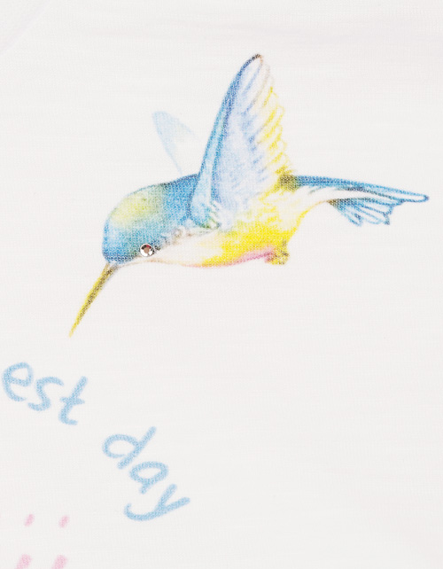 Знаете, как вызвать счастливую улыбку Вашей красавицы? Подарите ей очаровательную кофточку с романтичной рюшей по низу изделия, украшенную яркими надписями, цветочками и милой колибри! Нежная натуральная ткань позволит малышке наслаждаться комфортом весь