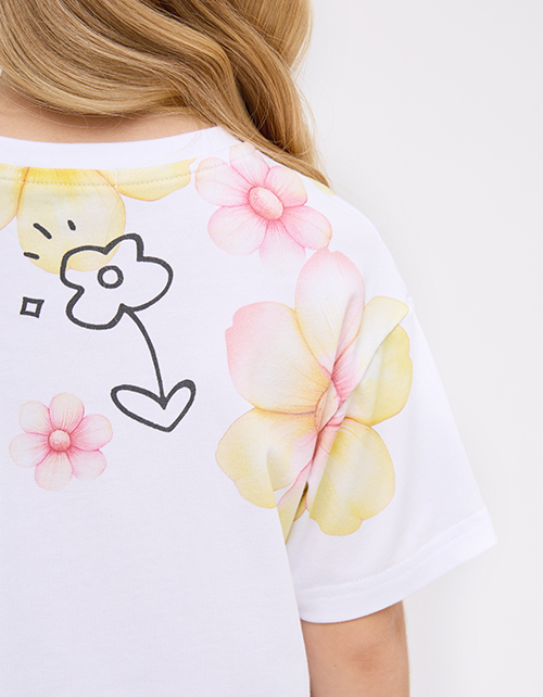 Белая укороченная футболка из мягкого хлопка создаёт лёгкий, современный образ. Oversize-посадка и прямой крой дают свободу движений. Авторский цифровой принт со стразами добавляет выразительный акцент и подчёркивает характер модели.
