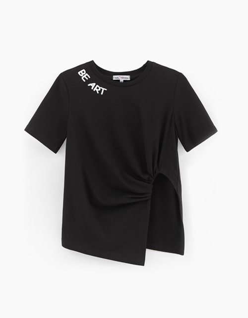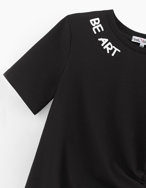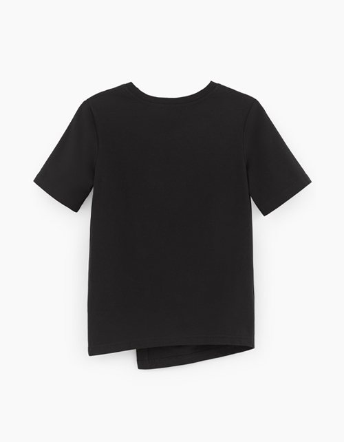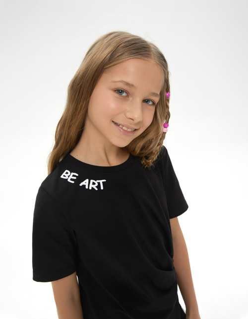Черная футболка для девочки. Модель полуприлегающего силуэта со спущенной линией плеча. Изделие из кулирной глади декорировано трансферной плёнкой. Удлинённая футболка с ассиметричным низом.
