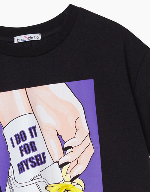 Черная футболка с ярким авторским принтом для девочки. Выполнена из кулирной глади. Декоративное изображение в стилистике капсулы дополнено оригинальным объемным элементом в виде желтого шнурка