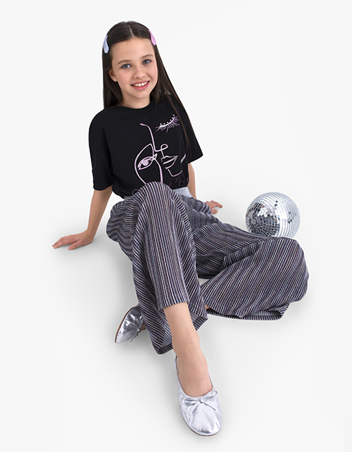 Черная футболка прямого кроя со спущенным рукавом. Выполнена из кулирной глади с эластаном. Декорирована принтом с серебряными стразами и аппликацией из блестящей пленки. Изделие хорошо комплектуется с любыми брюками коллекции, создавая модный образ.