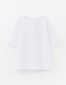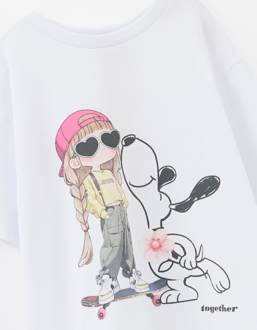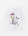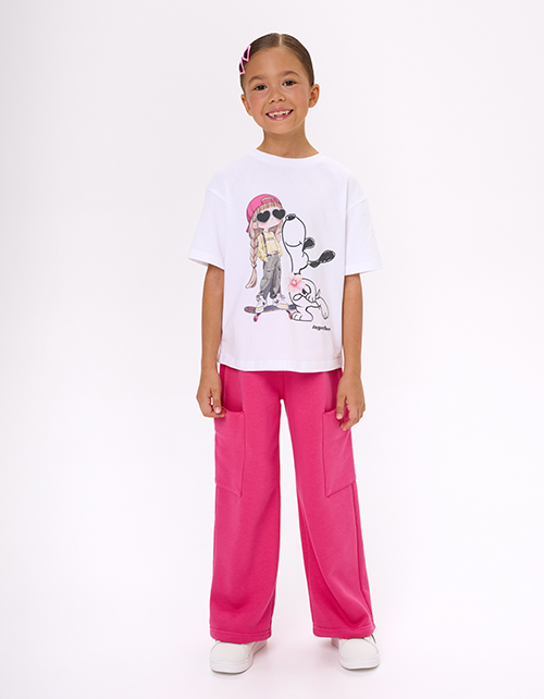 Белая футболка для девочки. Прямой силуэт обеспечивает комфорт. Короткий приспущенный рукав добавляет расслабленности. Эластичная горловина из рибаны мягко прилегает. Цифровой принт декорирован стразами, создавая яркий акцент.