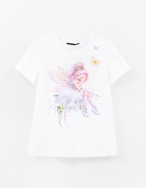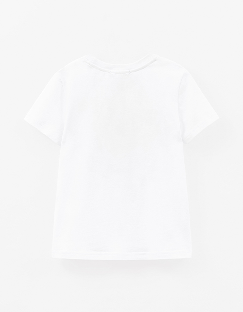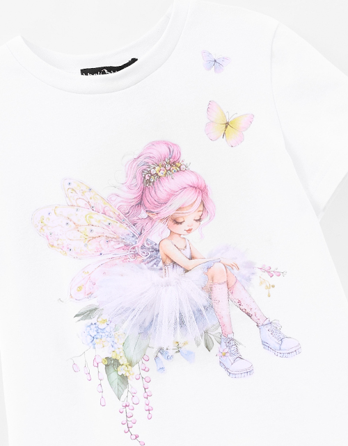 Белая футболка для девочки. Прямой силуэт обеспечивает комфорт. Короткий рукав и эластичная горловина из рибаны формируют аккуратную посадку. Цифровой принт дополнен стразами и отлётным декоративным элементом.