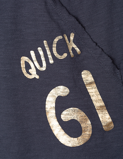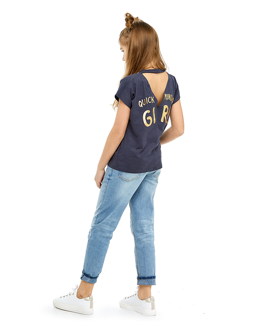 Стильная футболка свободной формы выполнена из комфортной натуральной ткани. Ультрамодный разрез на спинке и сияющая золотистая надпись делают модель яркой и оригинальной. Эксклюзивный дизайн подчёркивает индивидуальность девочки