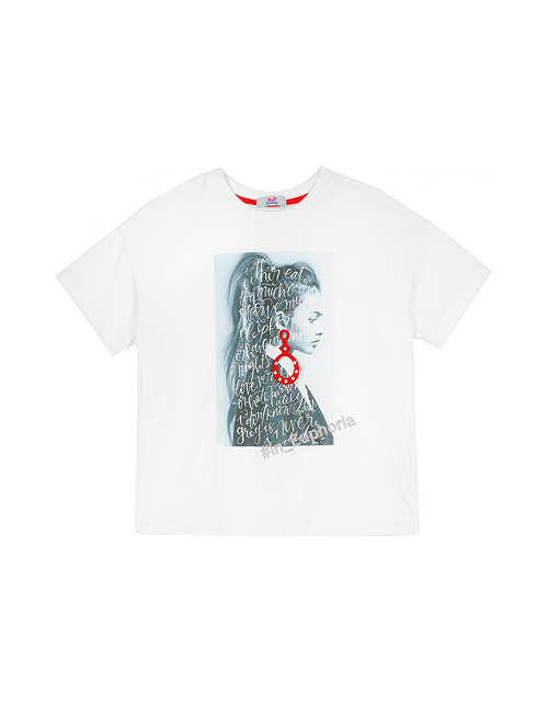 Белая футболка для девочки с рисунком имеет свободный силуэт и широкие короткие рукава для повышенного комфорта в жаркие дни. Выразительный принт с девушкой является главным дизайнерским акцентом, а короткая длина поддерживает ультрамодный дизайн.