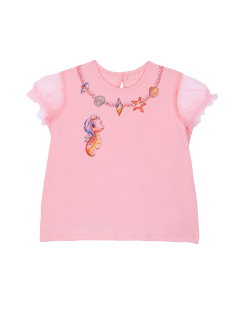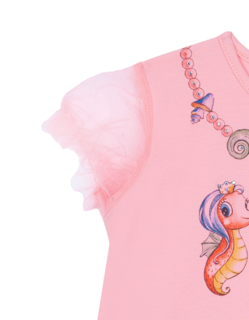 Футболка для девочки цвета светлый коралл. Дизайнерское оформление в стилистике капсулы "Ариэлла", дополненное стразами. Рукава из сетчатого полотна с оборками на концах. Функциональная застежка на пуговице.