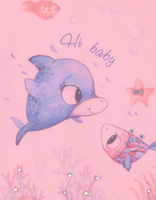 Футболка для девочки цвета светлый коралл. Принты дизайнерской тематики "Ариэлла". Декоративное сетчатое полотно украшено стразами. Функциональная застежка на пуговице на спинке.
