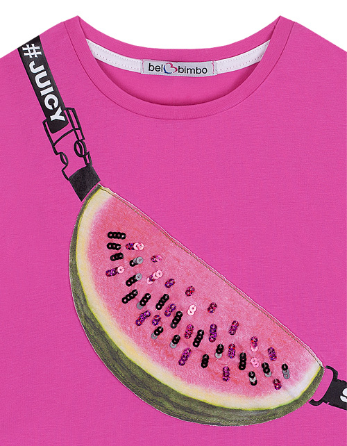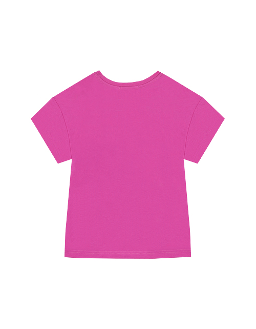 Розовая футболка для девочки. Круглый вырез горловины. Дизайнерское оформление в стилистике капсулы "Фруктовый микс". Удлиненная спинка.