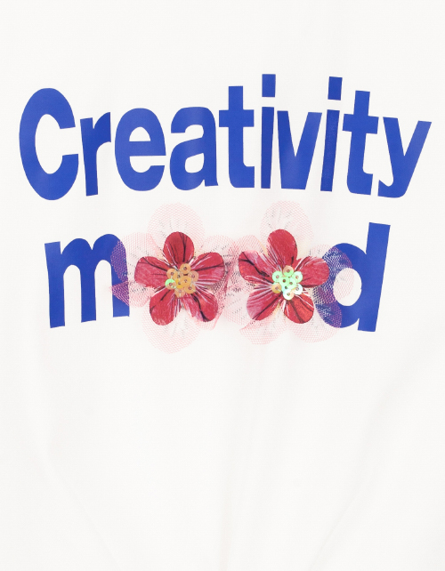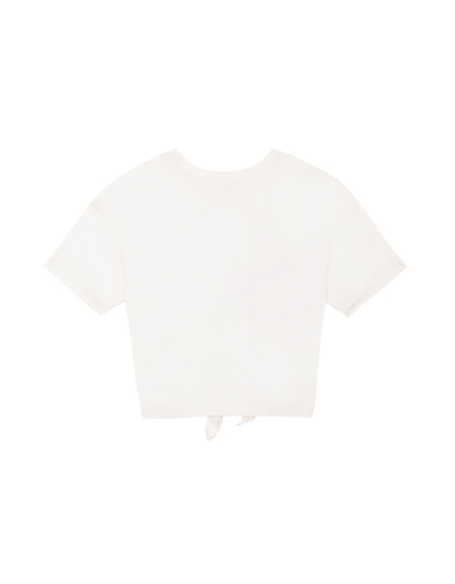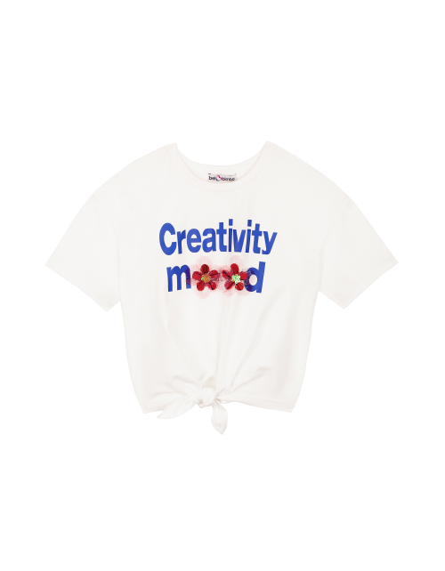 Футболка для девочки молочного цвета. Принт в стилистике капсулы "Цветочное сафари", дизайнерская нашивка. Декоративный узел в нижней части.