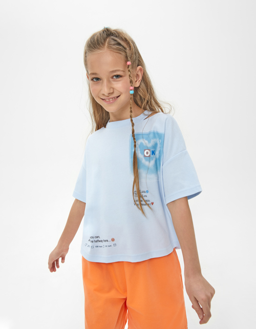 Стильная небесно-голубая футболка для девочки. Модель OVERSIZE с элементом чокера по горловине. Цифровой принт в качестве декора.