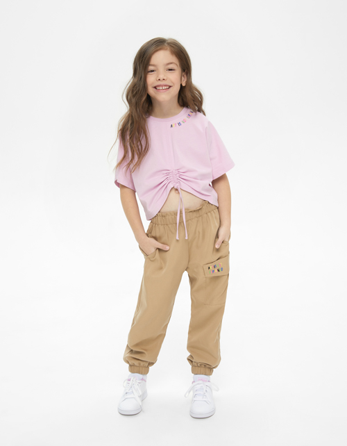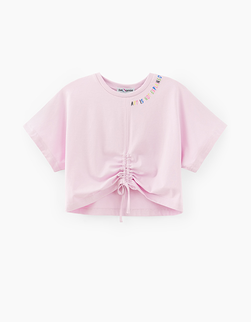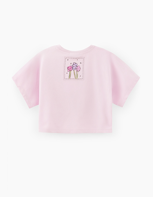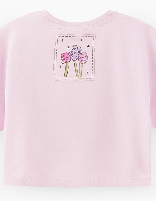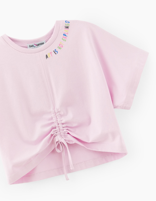Светло-сиреневая футболка для девочки. Укороченная широкая модель. Изделие со сборкой по передней полочке, благодаря чему можно менять формы. Футболка из кулирной глади декорирована вышивкой и принтом.