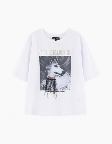 Стильная молочная футболка для девочки. Модель с ярким авторским принтом.
