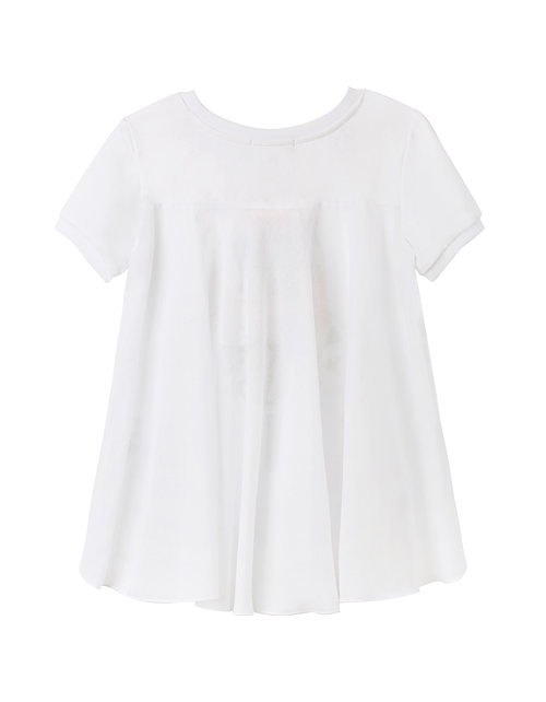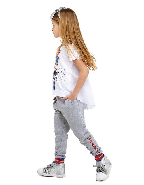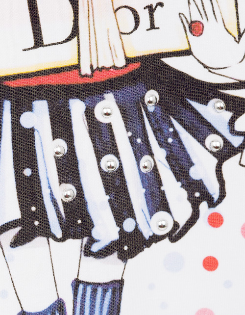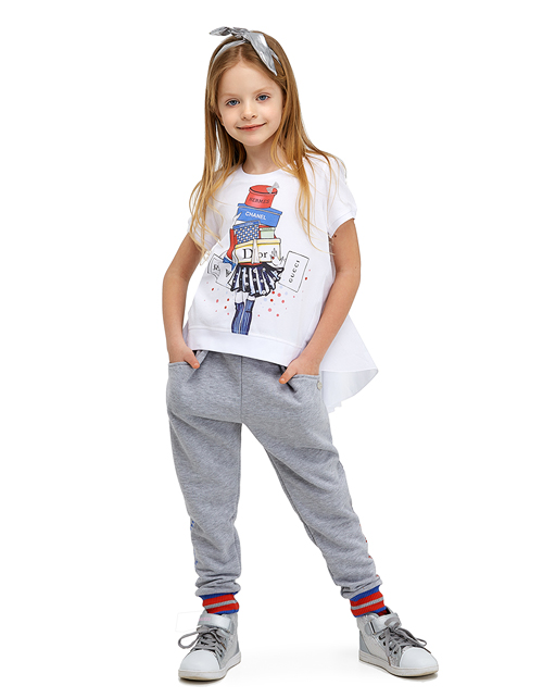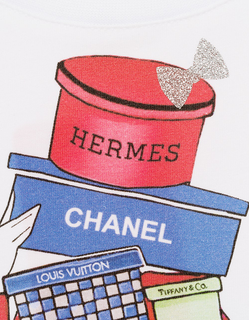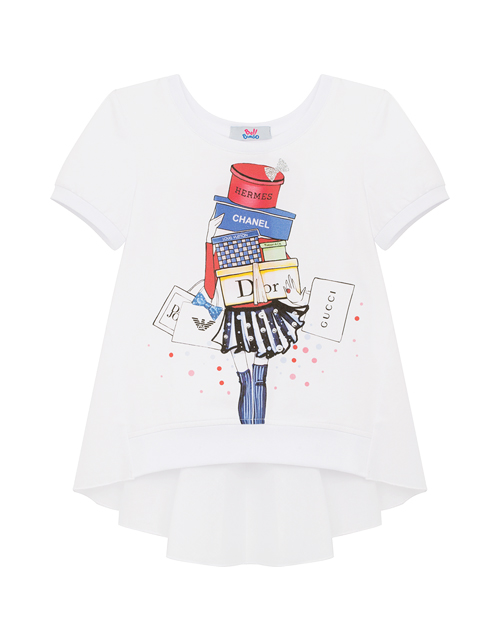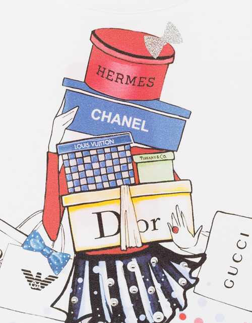 Настоящая модница знает: шопинг - дело первостепенной важности! Очаровательный джемпер, с удлиненной спинкой и коротким рукавом, посвящен всем любительницам совершать покупки. Яркий принт, сверкание страз и глиттера делают модель просто изумительной