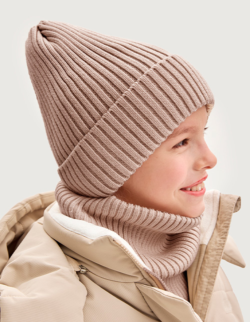 Бежевый зимний комплект для девочки: шапка с флисовой подкладкой и двойной снуд. Лёгко надевается, надёжно защищает от холода до -25°C и делает образ особенным - уютно, удобно, красиво.
