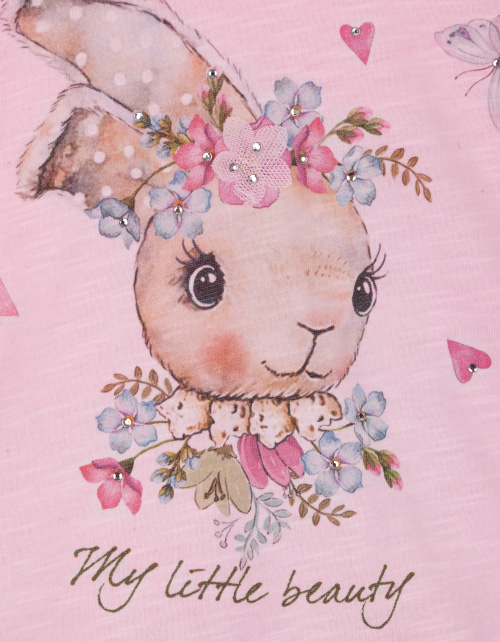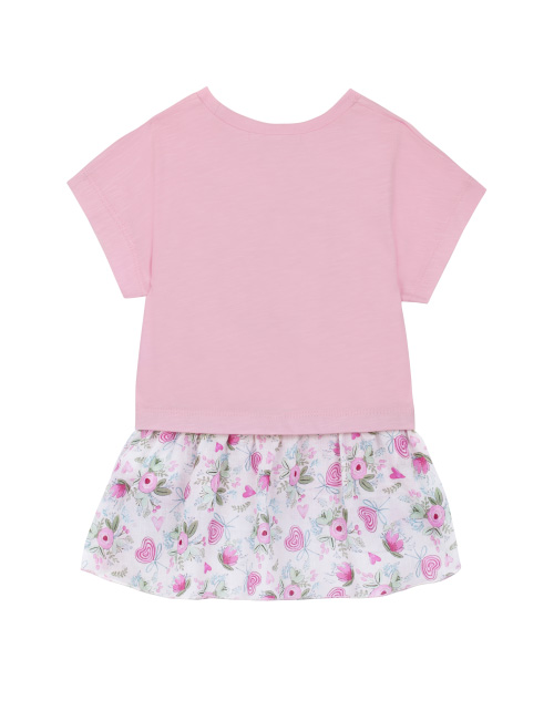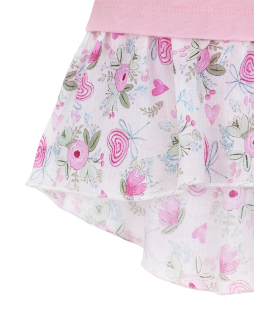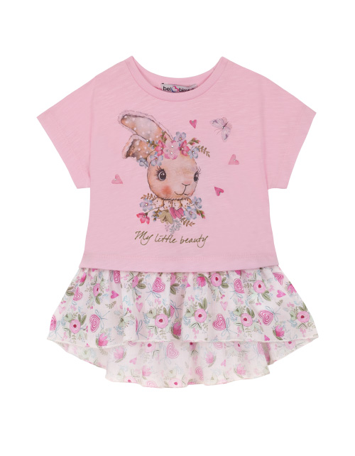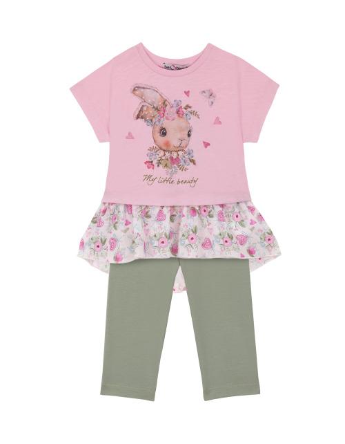 Повседневный комплект для девочки из футболки с баской и бридж. Розовая футболка с коротким рукавом и круглым вырезом горловины украшена нежным принтом и дополнена декоративной юбкой. Серые бриджи прямого силуэта.