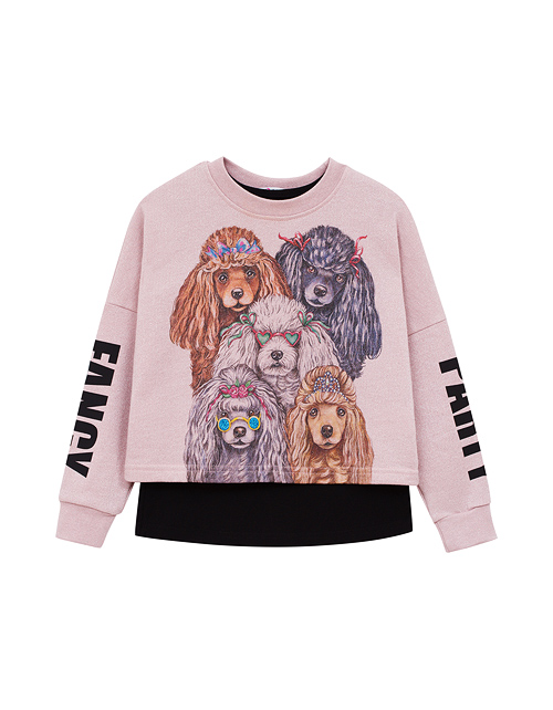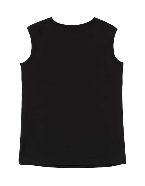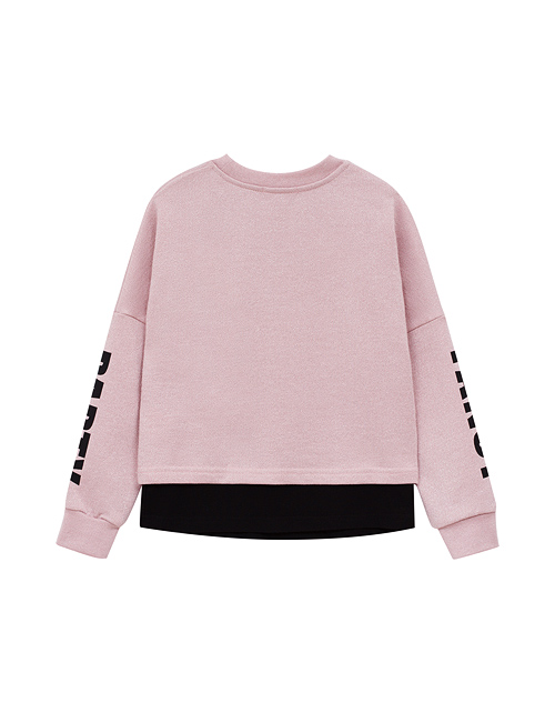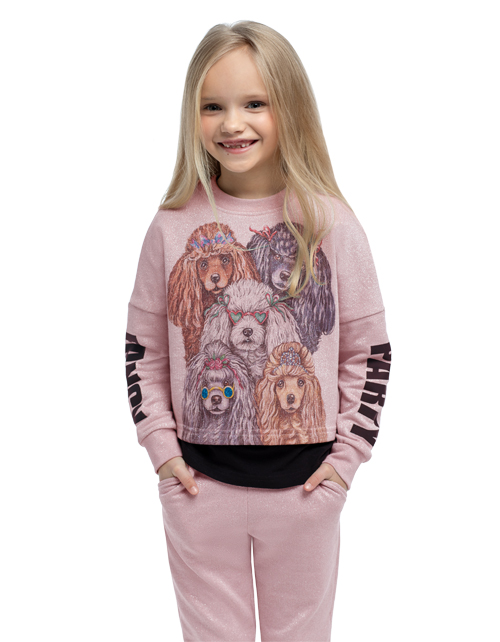 Комплект для девочки из укороченного свитшота и джемпера без рукавов. Верхний меланжевый свитшот с блесткой светло-розового цвета. Круглый вырез горловины. Оформление в стилистике капсулы "Модная тусовка". Нижний джемпер без рукавов черного цвета.