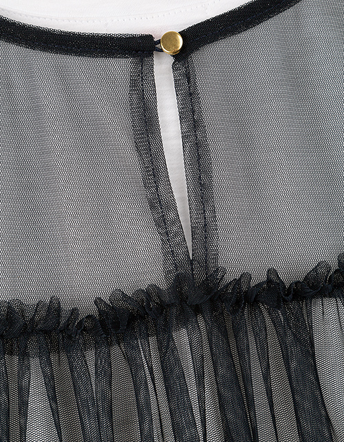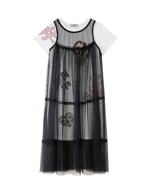 Яркий комплект создающий эффект трендовой многослойности. Укороченное платье-футболка декорировано актуальным молодёжным принтом. Верхнее платье выполнено из контрастного сетчатого полотна и придает образу лёгкость