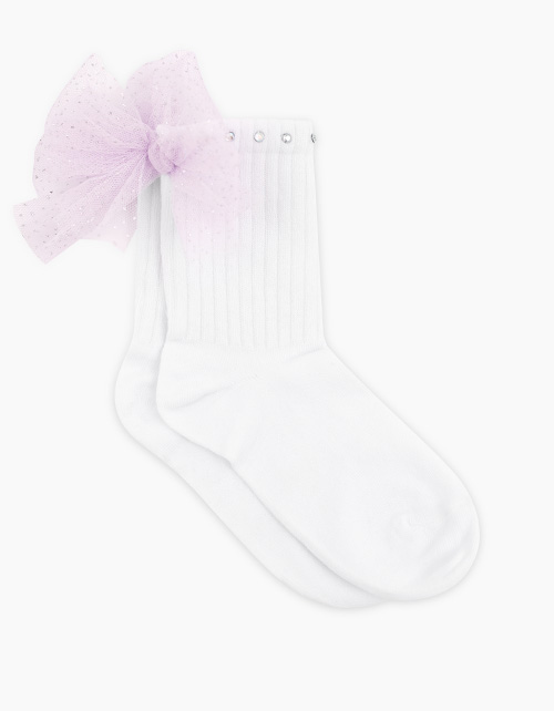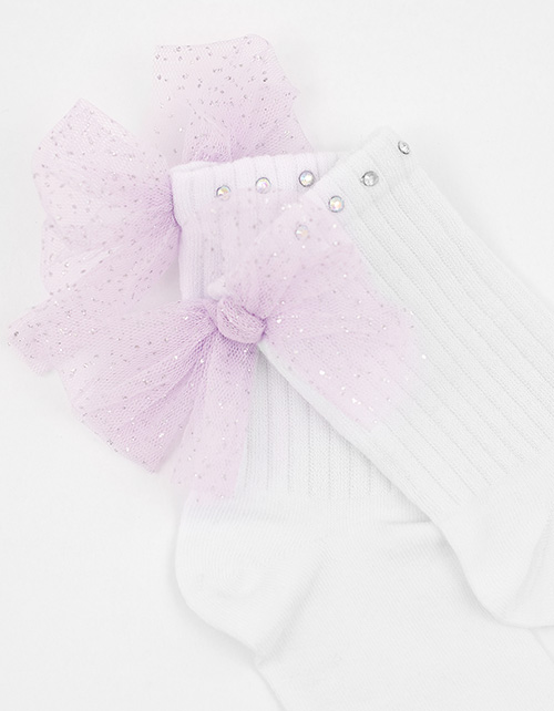 Комплект из двух пар. Белые носки для девочки. Лимитированная коллекция. Высокая удобная резинка. Одна пара декорирована светло-сиреневыми бантами из сеточки и стразами. Подойдут к любому летнему образу.