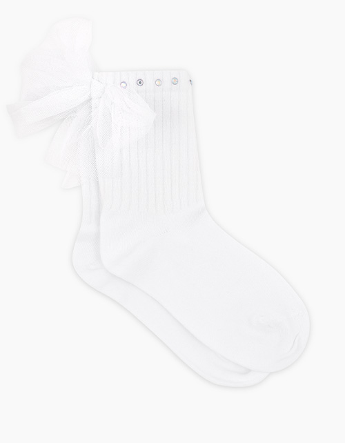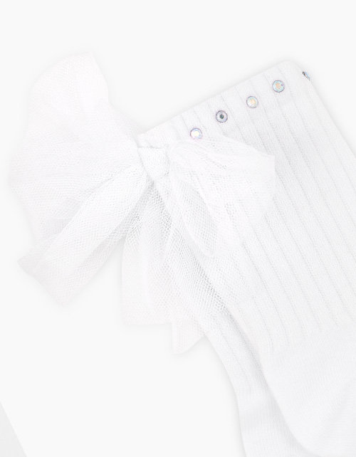 Комплект из двух пар. Белые носки для девочки. Лимитированная коллекция. Высокая удобная резинка. Одна пара декорирована белыми бантами из сеточки и стразами. Подойдут к любому летнему образу.