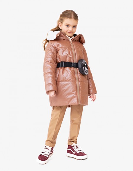 Зимняя куртка оттенка ириска со стильной сумочкой на поясе