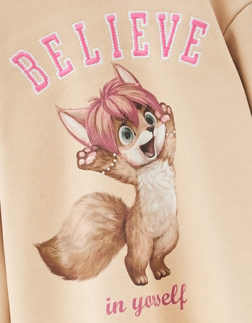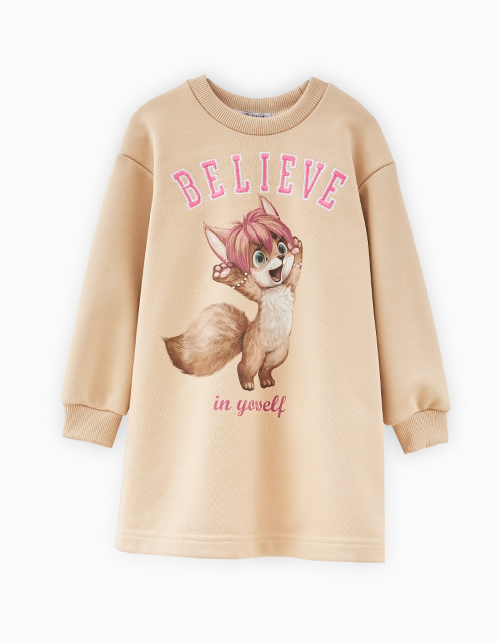 Стильное платье прямого силуэта выполнено в трендовом оттенке "сливочный латте". Модель декорирована тематическим принтом.