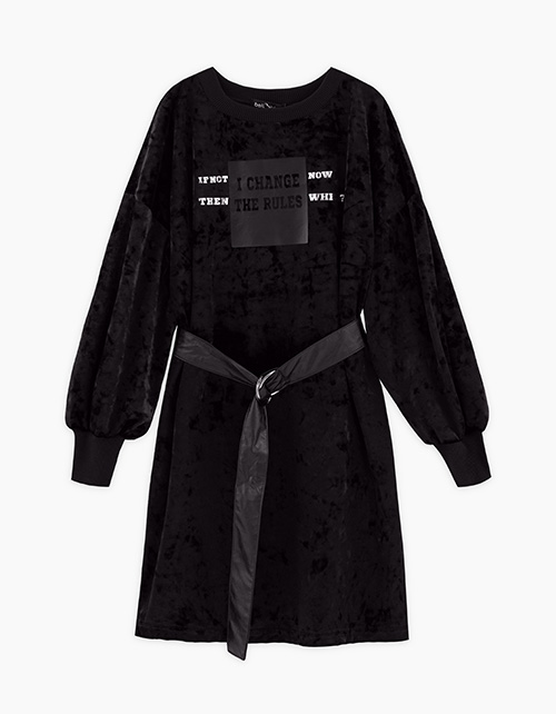Стильное чёрное бархатное платье для девочки. Прямая объёмная модель. Изделие со съёмным ремнём из эко-кожи с металлическими полукольцами. Горловина и манжеты из эластичной рибаны. Платье дополнено авторской трансферной печатью.