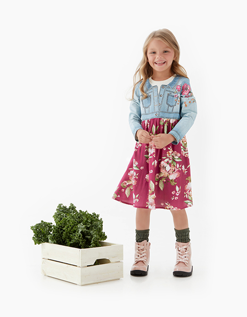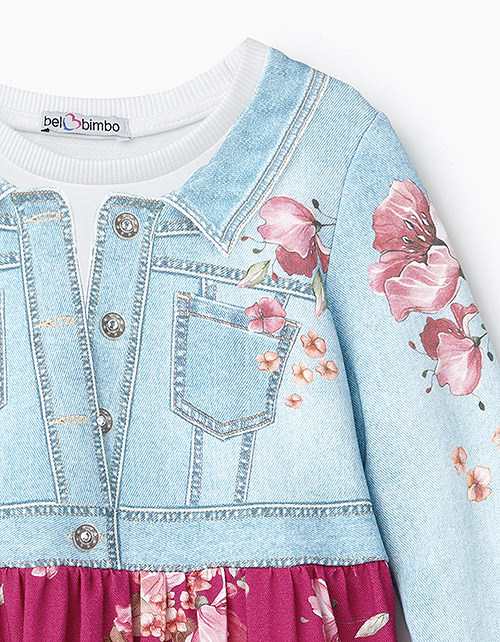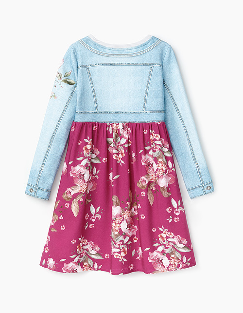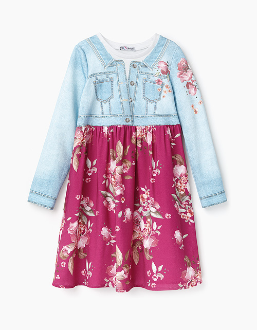 Платье-трапеция с завышенной талией из комбинации трикотажа и вискозы с набивным рисунком. Дизайн имитирует комплект из платья и джинсовой курточки с крупными пуговицами-стразами