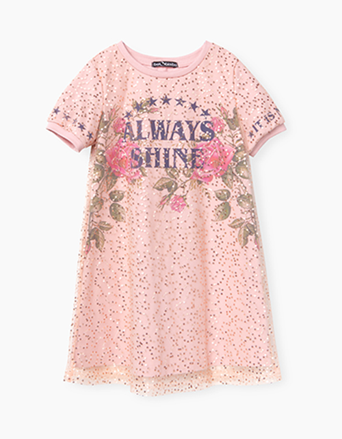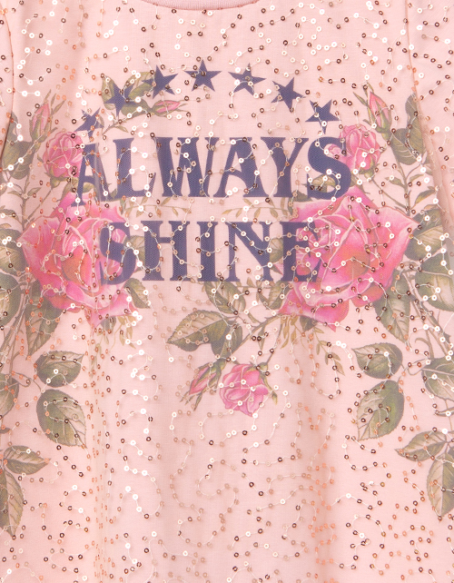 Нарядное платье А-силуэта в стиле спорт-шик с круглым вырезом и коротким рукавом. Выполнено из сетчатой ткани с пайетками на подкладке из кулирной глади светло-бежевого цвета. С надписью Always shine ("Всегда сияй")