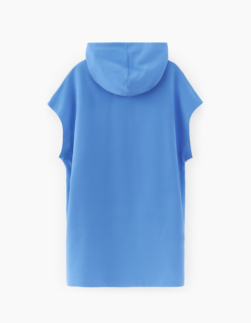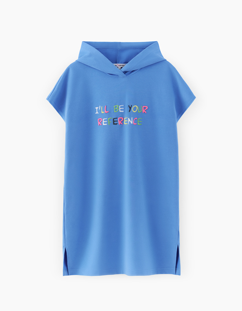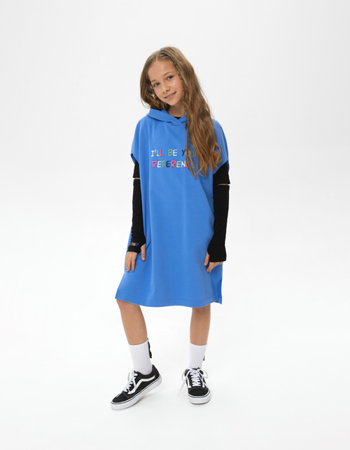 Лазурное платье-сарафан. Модель прямого силуэта со спущенной линией плеча. Изделие из футера с браш-эффектом декорировано объёмной разноцветной вышивкой. Платье стильно смотрится в паре с лонгсливом или футболкой из коллекции.