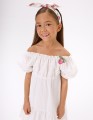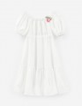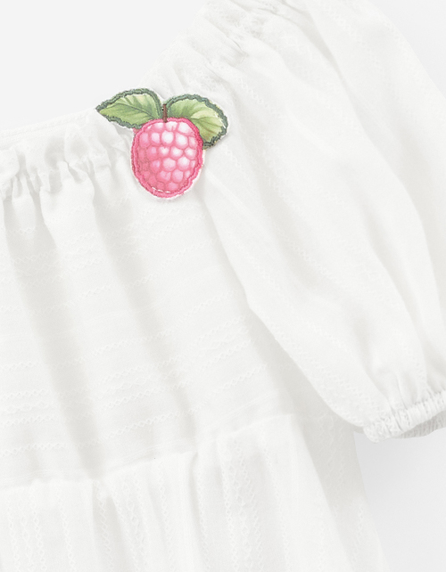 Молочное платье с А-силуэтом и вырезом каре создаёт лёгкий образ. Эластичная лента по горловине и по низу рукава добавляет комфорта. Нашивной элемент-малина выполнен как брошь. Спинка из натуральной кулирной глади, есть подкладка.