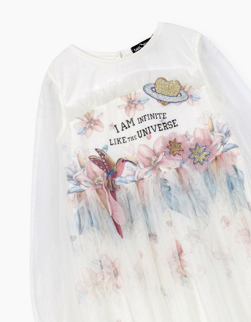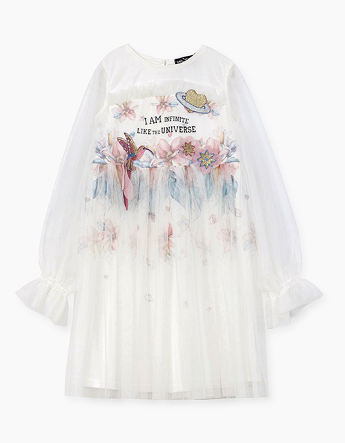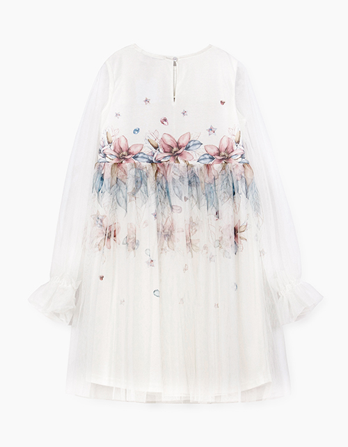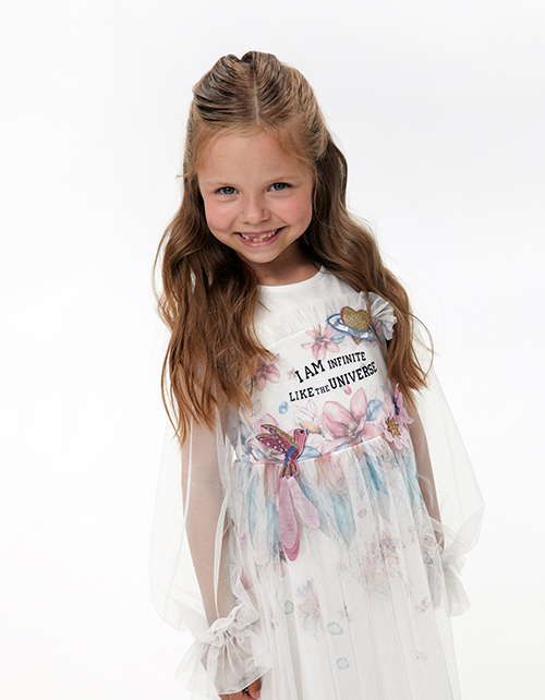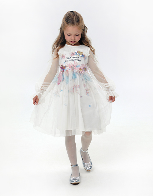 Дизайнерское платье А-образного силуэта. Застёжка на пуговицу в тон. Интересный рукав со сборкой внизу на тонкую резиновую нить. Сочетание материалов: кулирная гладь и сетчатое полотно. Авторская вышивка с аппликацией из сетки, украшенная пайетками