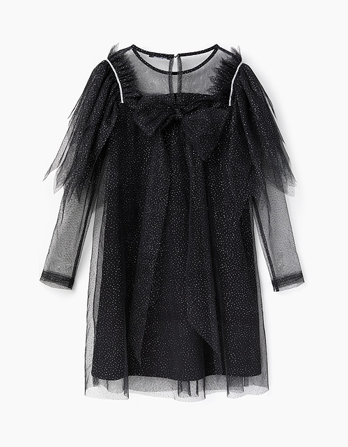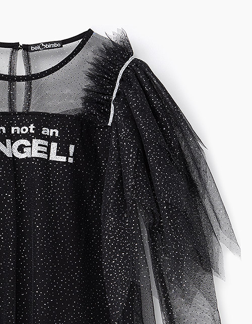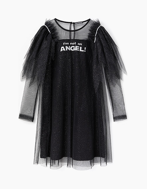 Платье А-силуэта с оборками-крыльями. Выполнено из сетчатого полотна в серебристые точки на трикотажной подкладке. С принтом из глиттера I'm not an angel ("Я не ангел"). Воздушный бант из сетки на спинке