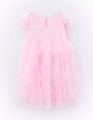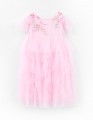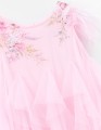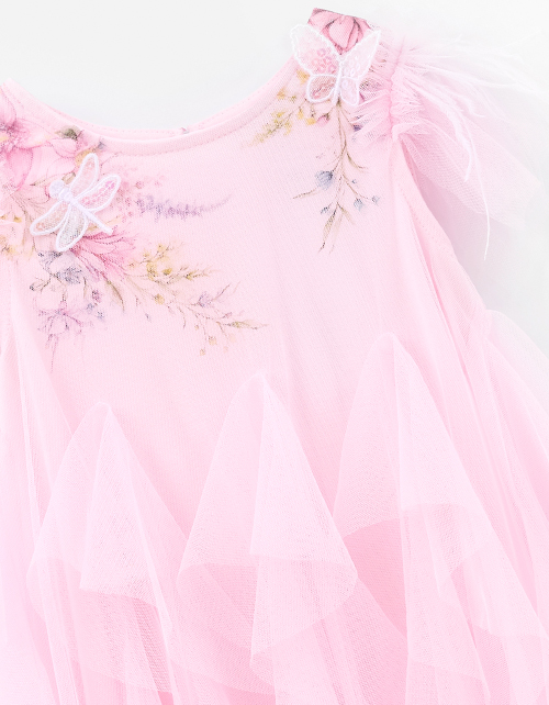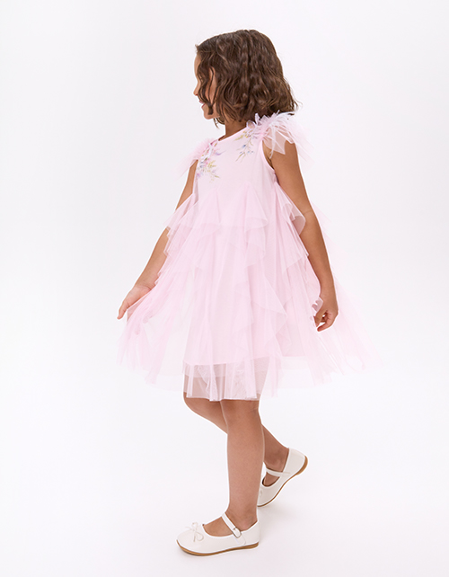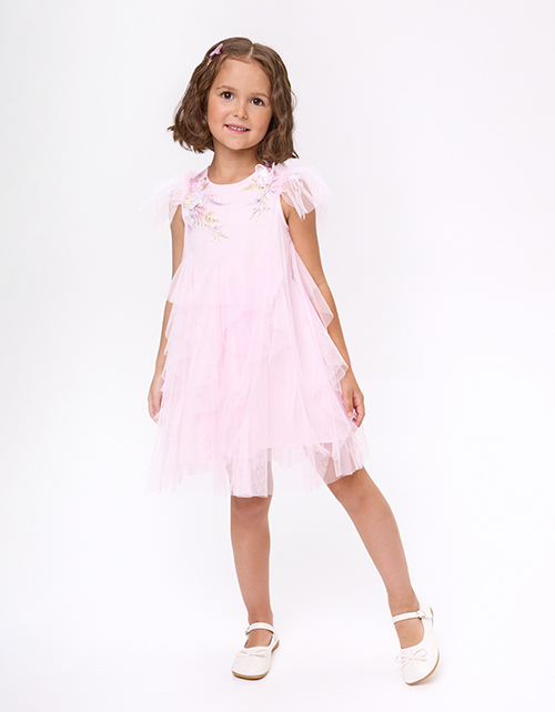 Дизайнерское платье для особого случая в ярком оттенке для девочки. Летящий А-образный силуэт из лёгкой ткани создаёт воздушность. Плечики с декоративными перьями, вышитые элементы с пайетками и пуговичка на спинке добавляют сияния.