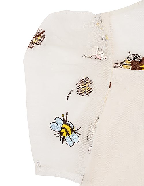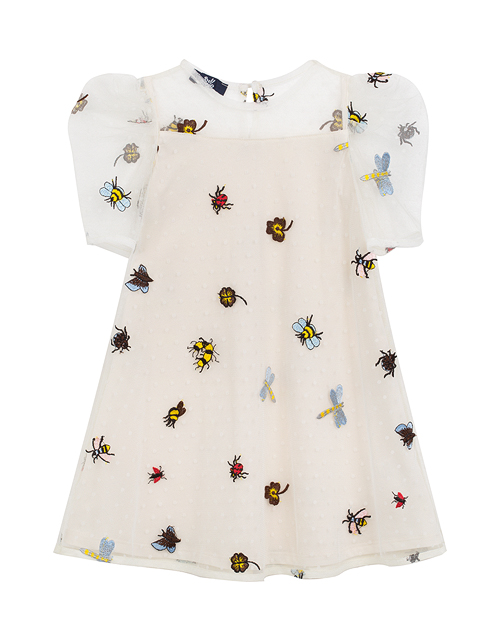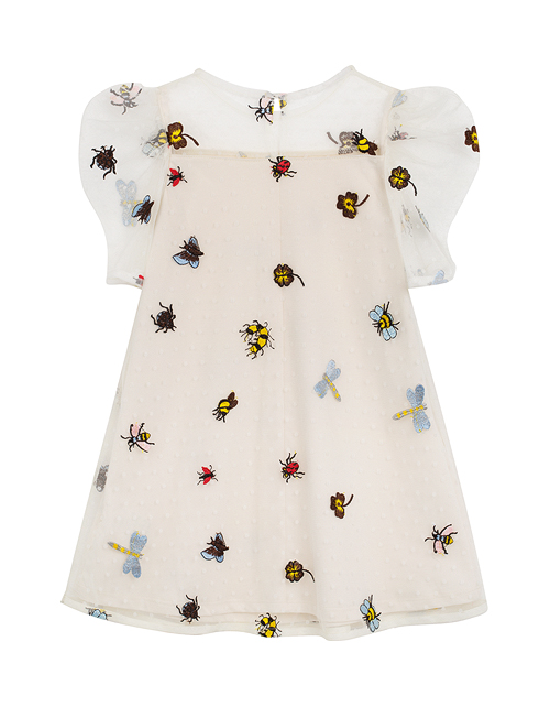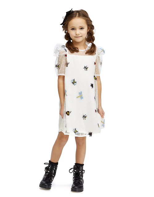 Изящное платье подчеркнёт обаятельность Вашей девочки! Модная сетчатая ткань, расшитая милыми и задорными обитателями мира насекомых, в комбинации с комфортной мягкой подкладкой из натурального материала, делает эту модель идеальным нарядом на особый случ