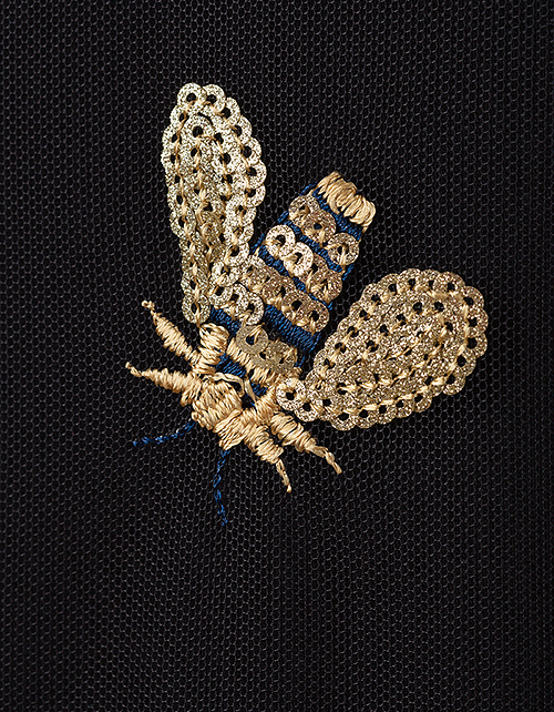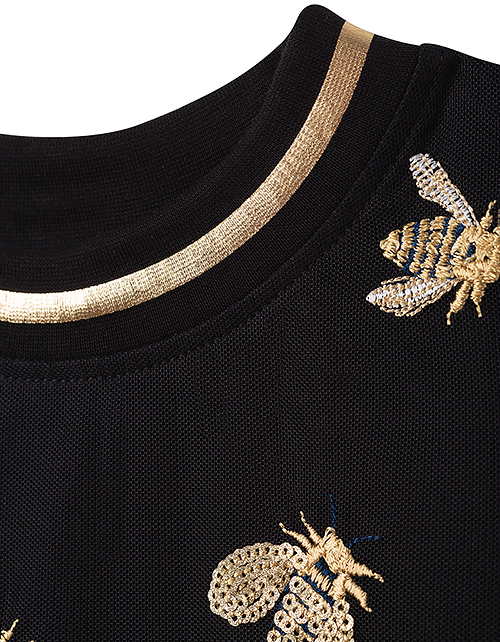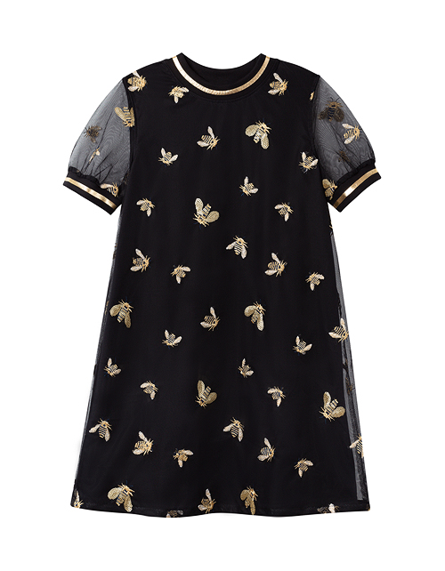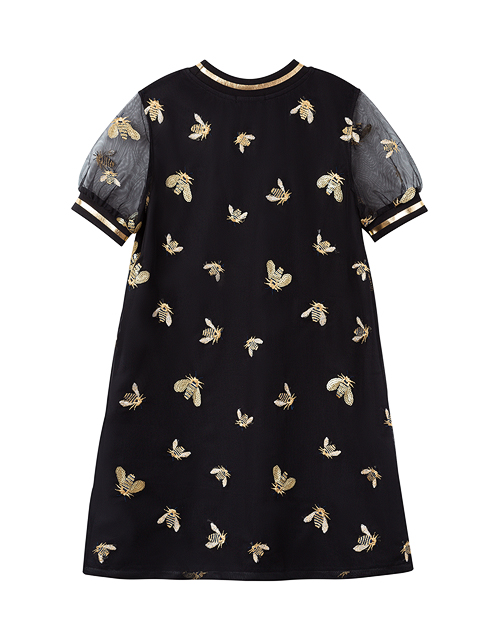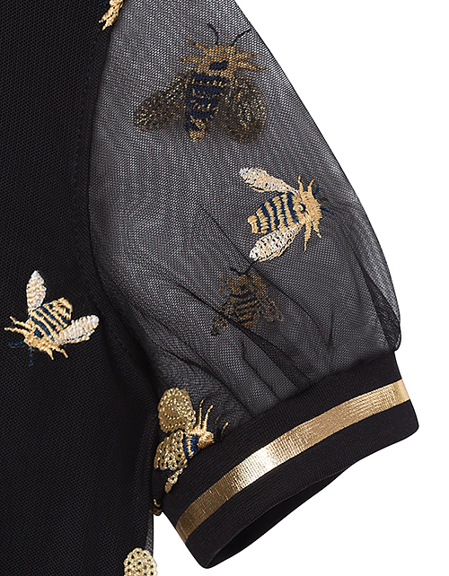 Дерзкое платье А-силуэта с ноткой стиля спорт-шик создано для самой модной красавицы! Подкладка из натуральной ткани обеспечит комфорт. Особую актуальность модели придаёт сочетание тонкой сеточки, расшитой сияющими пчелками, и манжет с золотыми полосками