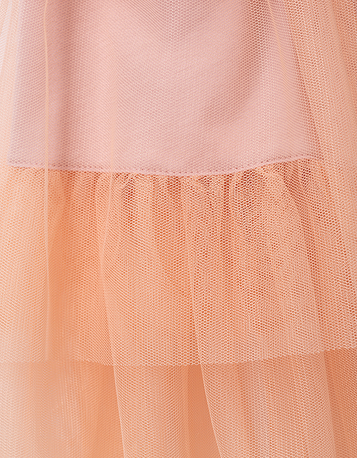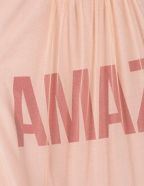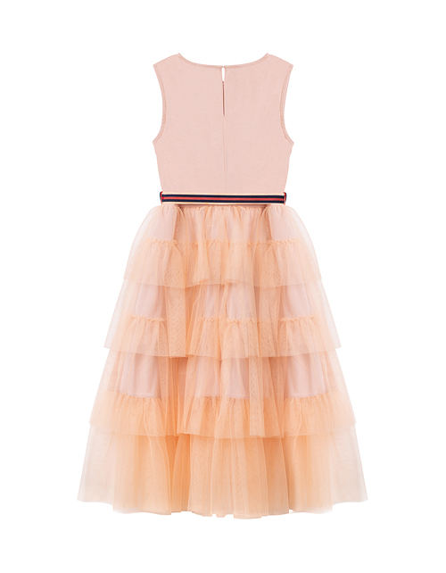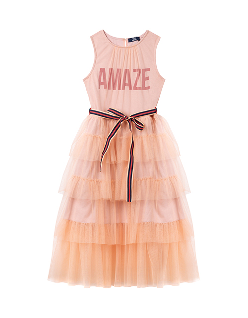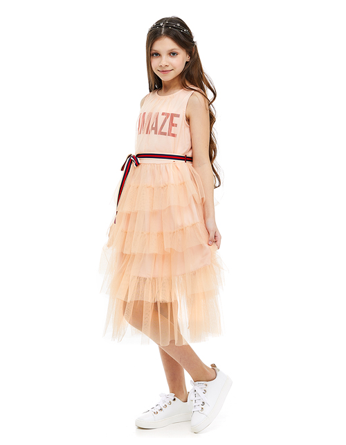 Яркое платье из лёгкой сеточки с модной многоярусной юбкой. Особую актуальность платью придаёт сочетание романтичного силуэта и элементов декора в спортивном стиле: шрифтового принта и контрастного пояса