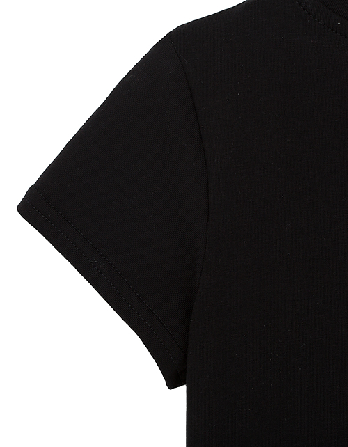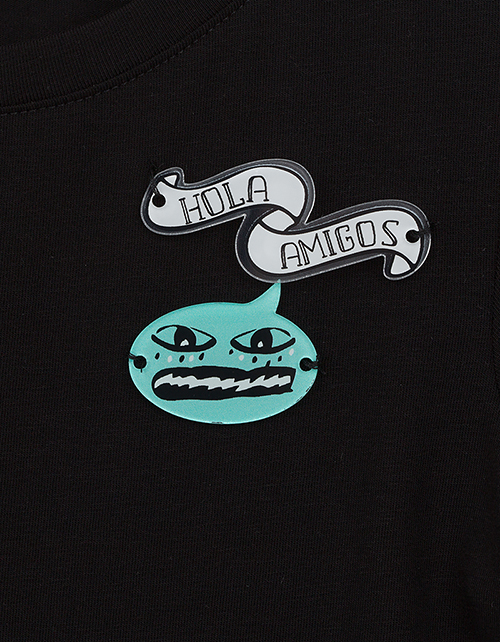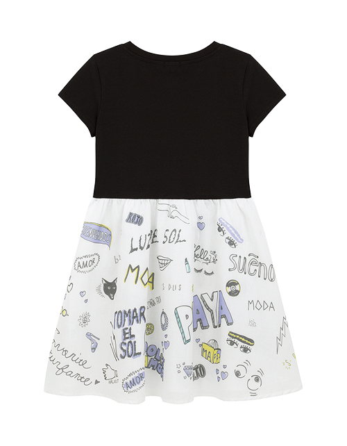 Эффектность романтичного платья основана на контрасте фактур и цвета. Сочетание тёмного верха и воздушной юбки, декорированной интересным принтом, имитирующим граффити, делает платье ярким и запоминающимся! Забавные значки придают модели озорное настроени